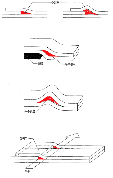 건축물의 옥상과 같은 경우 가장 열악한 조건이라고 할 수 있다. 열, 자외선, 오존, 산, 알칼리와 같은 화학적인 피로로 부터 진동이나, 침하와 같은 하지 거동 등의 물리적인 피로가 중첩되고 있다. 이와같이 여러가지 요인들의 중첩된 피로로 인하여 옥상의 바닥면, 특히 방수층은 노화 혹은 파단이 일어날 수 밖에 없으며, 누수에 따른 피해 유형은 다음과 같다.