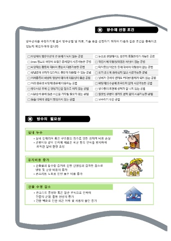 방수공사를 수행하기에 앞서 방수공법 및 재료, 기술 등을 선정하기 위하여 다음과 같은 조건을 총족하고