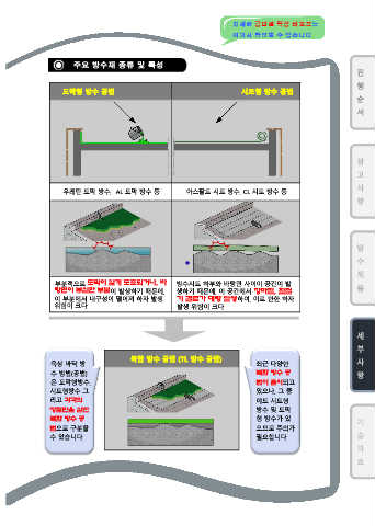 우레탄 도막 방수, AL 도막 방수 등 아스팔트 시트 방수, CL 시트 방수 등