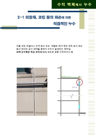 수 직 벽 체 에 서 누 수 2-1 외장재, 코킹 등의 파손에 의한 직접적인 누수 건물 외장 판넬이나 조적 등의 파손, 연결부 메지 혹은 코킹 등의 파손 등의 원인과 같이 외벽을 통하여 누수가 발생하는 경우임. 외벽 강수량은 옥상 바닥의 50% 정도로 보통 간주하여야 함.