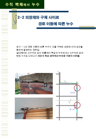 수 직 벽 체 에 서 누 수 2-2 외장재와 구체 사이로 경로 이동에 따른 누수 상기 1-2의 경로 이동에 따른 누수가 건물 구체와 외장재 사이 공간을 통하여 발생하는 경우임. 실내에서는 ①누수와 같이 창틀에서 똑같이 누수되거나 ②누수와 같이 천정 누수로 나타나기 때문에 옥상 바닥에서 누수와 구분이 어려움.
