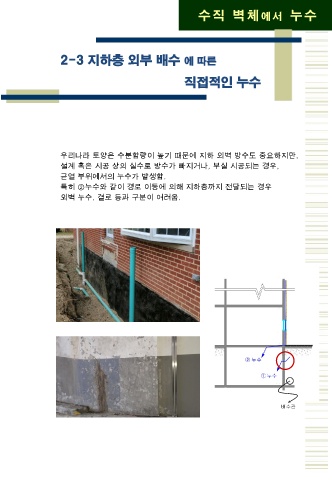 수 직 벽 체 에 서 누 수 2-3 지하층 외부 배수 에 따른 직접적인 누수 우리나라 토양은 수분함량이 높기 때문에 지하 외벽 방수도 중요하지만, 설계 혹은 시공 상의 실수로 방수가 빠지거나, 부실 시공되는 경우, 균열 부위에서의 누수가 발생함. 특히 ②누수와 같이 경로 이동에 의해 지하층까지 전달되는 경우 외벽 누수, 결로 등과 구분이 어려움. 배수관