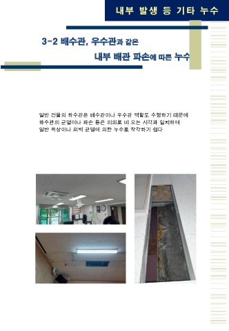 내 부 발 생 등 기 타 누 수 3-2 배수관, 우수관과 같은 내부 배관 파손에 따른 누수 일반 건물의 하수관은 배수관이나 우수관 역할도 수행하기 때문에 하수관의 균열이나 파손 등은 의외로 비 오는 시각과 일치하여 일반 옥상이나 외벽 균열에 의한 누수로 착각하기 쉽다
