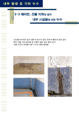 내 부 발 생 등 기 타 누 수 3-3 에어컨, 건물 지하와 같이 내부 시설물에 의한 누수 시스템 에어컨과 같이 배관이 보이지 않는 경우에 배관의 보온 실수 혹은 건물 지하 배수로 및 이중벽 설치 실수 등과 같이 건물 구조적 문제로 인한 누수도 종종 발생함.