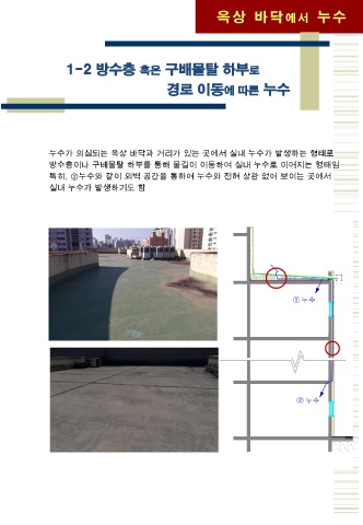 옥 상 바 닥 에 서 누 수 1-2 방수층 혹은 구배몰탈 하부로 경로 이동에 따른 누수 누수가 의심되는 옥상 바닥과 거리가 있는 곳에서 실내 누수가 발생하는 형태로 방수층이나 구배몰탈 하부를 통해 물길이 이동하여 실내 누수로 이어지는 형태임 특히, ②누수와 같이 외벽 공간을 통하여 누수와 전혀 상관 없어 보이는 곳에서 실내 누수가 발생하기도 함