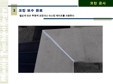 코 킹 공사 3 코 킹 보 수 완 료 필요에 따라 투명색 코킹이나 마스킹 테이프를 사용한다