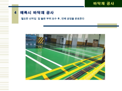바 닥 재 공 사 4 에폭시 바 닥 재 공 사 필요한 선작업 및 들뜬 부위 보수 후, 전체 공정을 완료한다