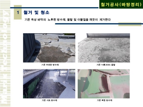 철 거 공 사 (바 탕 정 리 ) 1 철 거 및 청 소 기존 옥상 바닥의 노후된 방수재, 몰탈 및 이물질을 깨끗이 제거한다 기존 우레탄 방수재 기존 누름(보호) 몰탈 기존 시트 방수재 기존 복합 방수재