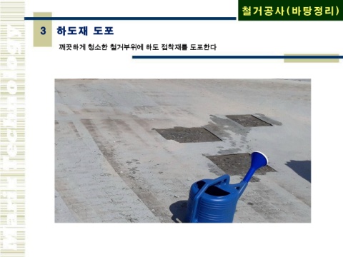 철 거 공 사 (바 탕 정 리 ) 3 하도재 도 포 깨끗하게 청소한 철거부위에 하도 접착재를 도포한다