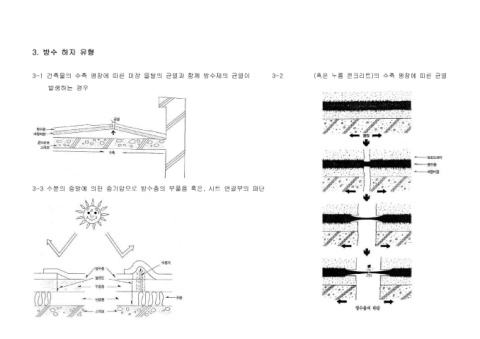 3. 방수 하자 유형 3-1 건축물의 수축 팽창에 따른 미장 몰탈의 균열과 함께 방수재의 균열이 3-2 (혹은 누름 콘크리트)의 수축 팽창에 따른 균열 발생하는 경우 3-3 수분의 증발에 의한 증기압으로 방수층의 부풀음 혹은, 시트 연결부의 파단