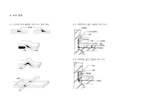 4. 누수 경로 4-1 방수재 접착 불량에 의한 누수 경로 제공 4-2 누름모르터 끝단 균열에 의한 누수 4-3 누름벽돌 끝단 균열에 의한 누수